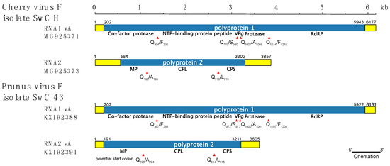 Genome organization of CVF and PrVF. The predicted cleavage sites and their positions are shown by red triangles with annotated amino acids. Untranslated regions are shown as yellow filled boxes. The nucleotide positions of genomic elements are marked at the extremities. The segments are drawn to scale. MP: movement protein; CPL: large capsid protein; CPS: small capsid protein; NTP: nucleoside triphosphate; VPg: genome-linked protein.