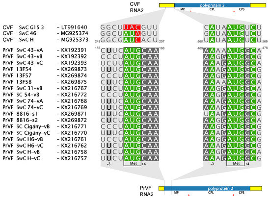 As for other fabaviruses, the genome of CVF–H is divided between two genomic segments (Figure 1). The organization is similar to members of the Fabavirus genus and, particularly, to that of PrVF. The sequences of two variants of the RNA1 segment, 6169 nucleotides (nt) and 6188 nt long, respectively, and of one 3857 nt long RNA2 segment were obtained. Further, each 3′ terminus had polyA tail of undefined length. The lengths of both RNAs are comparable with those of PrVF and other fabaviruses. RNA1 of CVF is among the longest species, with an exception of RNA1 of peach leaf pitting-associated virus that is 6357 nt long []. Both CVF and PrVF genomic RNAs contain a 10 nt long conserved region 5′-AACCGCUUUC-3′ at the 5′ untranslated region (UTR), a sequence similar to the one reported for other fabaviruses (5′-AACAGCUUUC-3′, the single mutation separating these conserved regions is underlined) [,]. A notable difference between CVF and PrVF is that the predicted MP of CVF is 91 amino acids (aa) shorter than that of PrVF []. This results in a 373 nt longer 5′ UTR for the CVF RNA2 segment. The analysis of a multiple alignment of available PrVF RNA2 sequences revealed that in a close vicinity to that of CVF’s AUG codon there is another potential PrVF start codon downstream of the previously described one (Figure 1). This second start codon of PrVF (Figure 2) is in a more favorable context for translation initiation, according to the Kozak’s rule [], when compared to the start codon of CVF RNA2, which has a uracil residue at the +4 position (Figure 2).