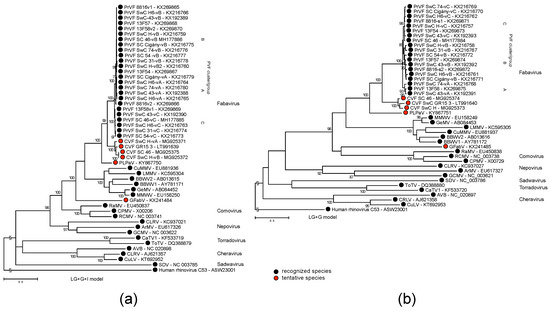 Maximum Likelihood phylogenetic tree of (a) CG–GDD region (ProPol), and (b) coat proteins domains of CVF, PrVF, and selected members of the family Secoviridae: Satsuma dwarf virus (SDV), arracacha virus B (AVB), cherry rasp leaf virus (CRLV), currant latent virus (CuLV), cherry leaf roll virus (CLRV), arabis mosaic virus (ArMV), grapevine chrome mosaic virus (GCMV), tomato torrado virus (ToTV), carrot torradovirus 1 (CaTV1), radish mosaic virus (RaMV), red clover mottle virus (RCVMV), cowpea mosaic virus (CPMV), grapevine fabavirus (GFabV), lamium mild mosaic virus (LMMV), cucurbit mild mosaic virus (CuMMV), broad bean wilt virus 1 (BBWV1), broad bean wilt virus 2 (BBWV2), gentian mosaic virus (GeMV), mikania micrantha wilt virus (MMWV, an isolate of GeMV), peach leaf pitting-associated virus (PLPaV), prunus virus F (PrVF), cherry virus F (CVF). The substitution model is shown above each tree. The sequence of human rhinovirus C53, an enterovirus, was used as an outgroup. Support values for partitions supported by less than 70% of bootstrap replicates are not shown.