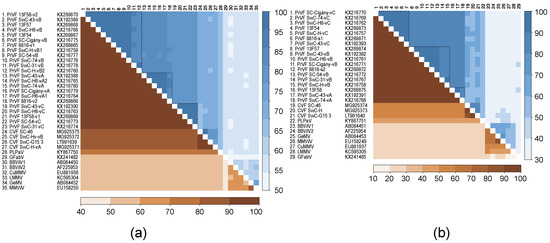 Figure 4 shows pairwise identity comparisons for the CG–GDD (Pro–Pol) region and the CPs between different isolates of CVF and PrVF and other fabaviruses. There is evident segregation of isolates into three Pro–Pol clusters and three CP clusters for PrVF. According to the currently applied criteria for species demarcation in the Secoviridae family, isolates of distinct species share less than 80% and 75% of aa identities in the Pro–Pol and CP regions, respectively [,,]. The divergence of the CPs between CVF and PrVF is higher than for the Pro–Pol region, reaching identity levels of only 50–60%, values that are well below the 75% species cut-off. At the same time, several isolates of PrVF were up to 84% identical with CVF isolates in the Pro–Pol region, while all comparisons provided values in excess of the 80% species cut-off. There is apparent separation of PrVF, CVF, PLPaV from the other fabaviruses in both analyzed regions: The aa identities were not higher than 60% for Pro–Pol and 40% for CP regions.