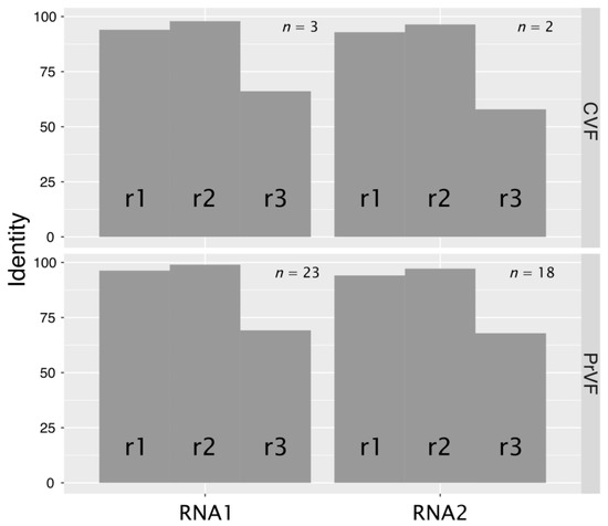 Levels of nt conservation between sequence variants of CVF or PrVF identified within individual plant samples were strikingly low, on average less than 80%, whereas the translated aa sequences were more conserved (Figure 4). Further analysis showed that the majority of changes were synonymous. The ratios between nonsynonymous and synonymous changes (dN/dS) were calculated to be 0.012 and 0.041 for RNA1 (n = 3) and RNA2 (n = 2) of CVF, respectively. The obtained values for PrVF were similar: 0.012 (RNA1, n = 23) and 0.047 (RNA2, n = 18). Substitution rates at the three codon positions (r1, r2, and r3) are in the order r3 > r1 > r2 (Figure 5). Analysis of substitutions between different variants of genomic RNA of CVF and PrVF revealed a strong bias toward the conservation at the r2 position, that likely reflects the invariably nonsynonymous nature of the second position substitution being under evolutionary constraint [].