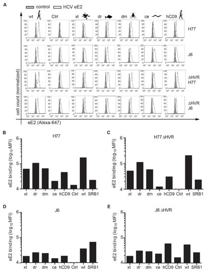 We then labeled HCV E2 ectodomains (eE2) from genotype 1a (strain H77) and 2a (strain J6) with Alexa fluorophores and tested for their binding to the respective CHO745 cells (Figure 2A). CHO745 cells transduced with SR-BI served as additional positive control []. Both eE2 from H77 and J6 bound to cells expressing SR-BI (MFI 22,000 and 65,000, respectively), hCD81 (MFI 170,000 and 35,000, respectively) and the xt, dr, dm, and hCD9 chimeras (45,000–105,000 and 18,000–25,000, respectively) (Figure 2B,C). CHO 745 cells expressing the ce chimera bound eE2 with reduced efficiency (20,000 and 15,000, respectively) (Figure 2B,C). The reduced binding of eE2 to the ce chimera correlated with the reduced chimera cell surface expression level (Figure 1D). To enhance eE2 binding to the surface expressed hCD81 LEL, we performed the same binding assay with eE2 proteins deleted in their hypervariable region 1 (ΔHVR1). Deletion of this E2 domain is thought to increase CD81 binding and at the same time decrease SR-BI binding [,,]. In line with these reports, the deletion of HVR1 from genotype 2a (J6) eE2 enhanced binding to the hCD81 chimeras. For instance, binding to the hCD9 chimera increased three-fold for ΔHVR1 J6 eE2 as compared to wildtype J6 eE2 (Figure 2B or Figure 2D). For genotype 1a (H77) ΔHVR1 eE2, hCD81 binding was not increased (Figure 2C or Figure 2E) suggesting that H77 eE2 binding to the hCD81 LEL is not shielded by the HVR1 region in this assay. As expected, ΔHVR1 eE2 from J6 strain bound to SR-BI expressing CHO745 cells less efficiently than full-length eE2 (Figure 2C or Figure 2E). In summary, all surface expressed hCD81 chimeras bound eE2 from HCV genotypes 1a and 2a to a degree that correlated with the number of chimera positive cells.