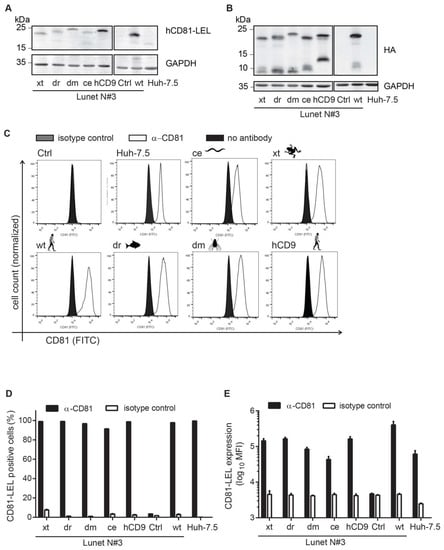2.2. Cell Culture, Ectopic Expression of Tetraspanin Variants in Lunet N#3 Cells and CHO745 Cells, HCV Replicons, HCV Pseudoparticles, and Cell Culture-Derived HCV (HCVcc)