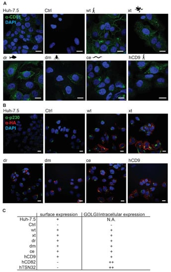 We further assessed the subcellular localization of the seven chimeras in Lunet N#3 cells by confocal microscopy (Figure 4B). Parental hCD81 localized to the cell surface and to intracellular compartments including the Golgi apparatus. A similar staining pattern was observed for the five chimeras (hCD9, xt, dr, dm, and ce), however with somewhat less surface staining and more or less dispersed intracellular staining. The hCD82 and hTSN32 chimeras, which we excluded from further analysis due to their lacking surface expression, indeed exclusively localized to the Golgi (Figure S1A–D). Thus, immunofluorescence microscopy confirms surface targeting of hCD9, xt, dr, dm, and ce chimeras.