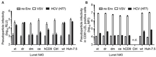 The hCD81 backbone influences HCV pseudoparticle infectivity. (A) Chimera expressing Lunet N#3 cells and Huh-7.5 cells were transduced with lentiviral pseudoparticles encoding Firefly luciferase and displaying the glycoproteins of HCV (strain H77) or VSV. Pseudoparticles without glycoproteins (no Env) served as negative control. Pseudoparticle infectivity was measured at 72 hpt by quantitation of luciferase activity; (B) Infectivity of GFP encoding lentiviral pseudoparticles displaying HCV (H77) glycoproteins, VSV glycoproteins, or no glycoproteins in chimera expressing Lunet N#3 cells and Huh-7.5 cells. At 72 hpt cells were counterstained with anti-hCD81 antibody, and infectivity of lentiviral GFP pseudoparticles in the hCD81 LEL positive subpopulations quantified. n.d., not detected, i.e., CD81 positive cells below 1000 counts. All experiments were performed at least thrice and are represented as mean + SD of three independent biological replicates (A) or technical triplicates (B).