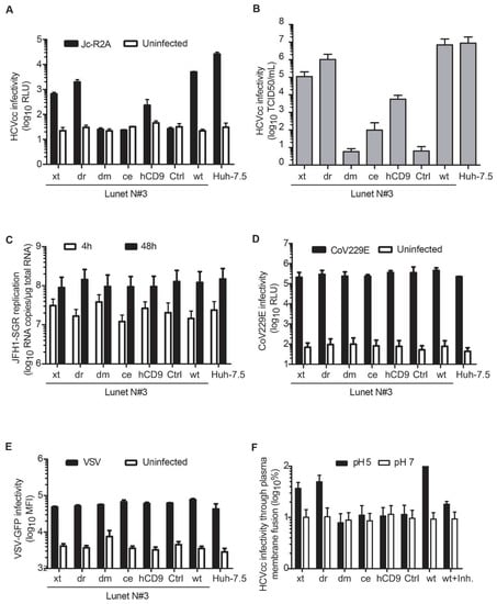 CD81 has previously been reported to have subtle effects on cell proliferation [] and to be important for membrane microdomain formation [,]. To exclude effects of the hCD81 chimeras on cell proliferation or gross membrane organization, we assessed susceptibility to hCD81-independent enveloped viruses. Human coronavirus 229E (CoV) and vesicular stomatitis virus (VSV) infected hCD81 or tetraspanin chimera expressing Lunet N#3 cells with equal efficiencies (Figure 6D,E). Thus, tetraspanin chimera expression in Lunet N#3 cells did not affect generic cellular functions required for virus infection.