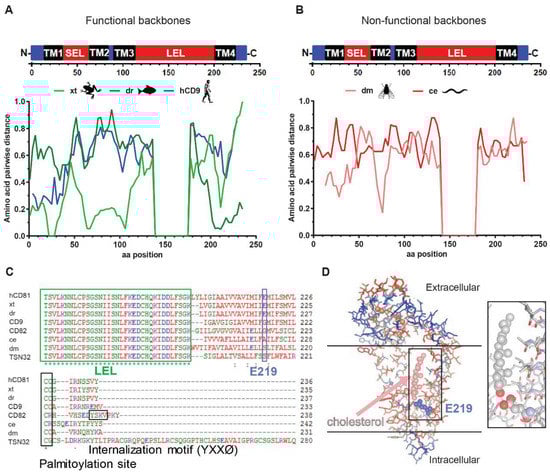 Here, we set out to investigate whether regions of hCD81 outside the LEL are critical determinants of HCV entry. Therefore, we constructed and characterized chimeric tetraspanins composed of the hCD81 LEL and backbone domains (intracellular tails, transmembrane domains, small extracellular loop and intracellular loop) of related tetraspanin molecules (orthologs and paralogs). Three out of seven tested chimeras can bind HCV E2 glycoprotein, but fail to support HCV cell entry. In particular, backbones from distantly related tetraspanins such as the Drosophila melanogaster (dm) ortholog and hCD9 fail to function as efficient HCV receptors. While for some chimeras reduced surface expression correlates with reduced receptor function, the dm and hCD9 chimeras are surface expressed, bind HCV E2 glycoprotein, but fail to support HCV infection. Specifically, we identified the E219 residue in transmembrane domain four of hCD81, which coordinates cholesterol and is lacking in hCD9, to promote HCV infection. Together, these data highlight the critical role of hCD81 backbone domains in post-binding HCV entry events.