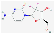 | Mycophenolic acid | IMPDH | [24,25,26,27,28,29] | [29,30] | ![]() | Gemcitabine | Cytosine→Cytidine Uracil→Uridine | Table 1 | [23] | ![]() |