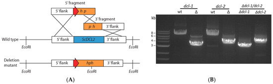 (A) Generation of deletion mutants for dicer genes in S. sclerotiorum using the split-marker gene replacement method (orange: selective marker, ex. hph; blue: gene replaced, ex. dcl-2; red: TrpC promoter) and (B) electrophoresis gel image of PCR amplification to confirm dicer gene disruption using F1–F4 primer pairs. Amplicons of wild-type dcl-1 and dcl-2 genes (7.7 kb and 7 kb, respectively) and deletion alleles (3.3 and 3.9 kb) differ in size. Lanes 5 and 6 show deletion alleles (3.1 and 3.9 kb) in the double dicer mutant.