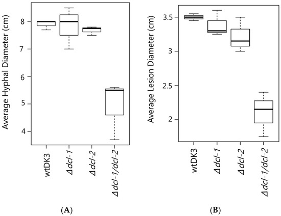 (A) Average mycelial growth of wild-type S. sclerotiorum and dicer gene disruption mutants grown on PDA for four days; and (B) lesion diameter measurements 72 hpi comparing wtDK3, ∆dcl-1, ∆dcl-2 and ∆dcl-1/dcl-2 virus-free cultures inoculated on canola leaves.