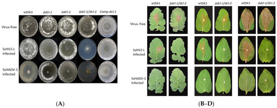(A) Colony morphology of virus-free and virus-infected wild-type, mutant, and complemented strains: (Top row) virus-free wtDK3, ∆dcl-1, ∆dcl-2, ∆dcl-1/dcl-2 and Comp-dcl-1. (Middle row) strains infected with hypovirus, SsHV2-L; and (Bottom row) strains infected with SsHADV-1. Cultures were grown for seven days on PDA at room temperature. Virulence assays on: (B) detached canola leaves; (C) detached soybean leaves; and (D) detached sunflower leaves. Plugs were taken from the edge of actively growing wtDK3, ∆dcl-1 (not shown), ∆dcl-2 (not shown) and ∆dcl-1/dcl-2 cultures and inoculated onto detached leaves stored at 20 ± 1 °C. Lesion size was measured 36 h post-inoculation.
