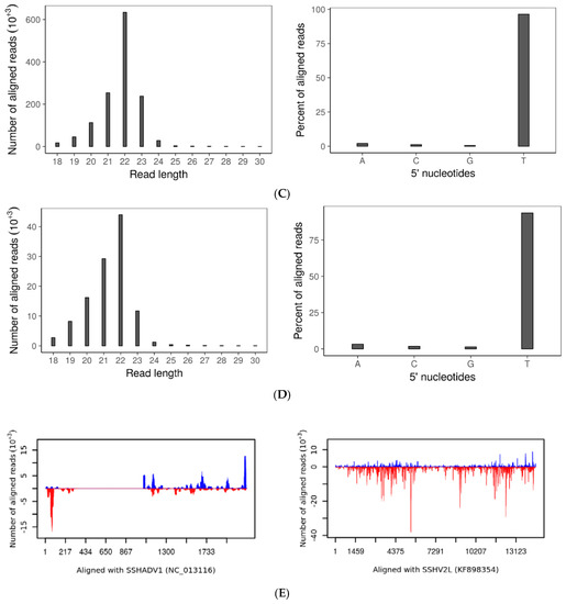 Small RNA: (A) Size distribution (left) and frequency of 5′ terminal nucleotides (right) of small RNAs in wtDK3; (B) size distribution (left) and frequency of 5′ terminal nucleotides (right) of small RNAs in ∆dcl-1/dcl-2 disruption mutant; (C) size distribution (left) and frequency of 5′ terminal nucleotides (right) of small RNAs aligned to SsHV2-L genome; (D) size distribution (left) and frequency of 5′ terminal nucleotides (right) of small RNAs aligned to SsHADV-1 genome; and (E) distribution of small RNA reads that aligned to the SsHADV-1 genome plus or minus strands (left) and distribution of small RNA reads that aligned to the SsHV2-L genome plus or minus strands (right). Bars above zero indicate alignment to the positive strand, and bars below zero indicate alignment to the negative strand.