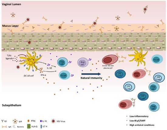 As depicted in Figure 1, natural genital mucosal immunity to HIV in HESN CSWs likely implies a strong capacity to generate efficient anti-viral responses and at the same time to prevent excessive inflammation. It likely involves orchestration of first-line innate immune responses in conjunction with matured high-affinity adaptive responses, which is expected to operate at cervicovaginal mucosal sites, which are ports of entry and replication for the virus. Promotion of regulatory DC-10-like, Treg, Tr1 and possibly Breg cells locally may contribute to the maintenance of a low-inflammatory genital milieu. This allows balanced responses from effector populations. The fact that BLyS/BAFF levels are contained helps to maintain the integrity of innate, possibly MZ-like, B-cell responses, the latter of which likely produce IgG and/or IgA capable of binding to HIV Env.