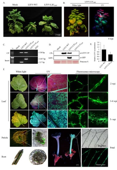 The “add-a-gene” strategy, i.e., engineering of an autonomous expression cassette controlled by an additional sgRNA promoter or CE, is preferred in developing closterovirus-based vectors for stable and high-level expression []. Genes placed closer to the 3′ terminus of the closterovirus genomic RNA tend to be expressed in greater amounts []. Therefore, for the bipartite LIYV genome, we inserted a GFP expression cassette, including the GFP ORF and a homologous duplication of 150 nt upstream of the LIYV CP ORF as the sgRNA CE, into the LIYV infectious cDNA clones. The cassette was inserted between the P34 ORF and 3′-nontranslated region (NTR) of RNA1, and between the P26 ORF and 3′NTR of RNA2, referred to as L1CGFP and L2CGFP respectively (Figure 1). The combinations of the wild-type RNA1/RNA2 (LIYV-WT), L1CGFP/RNA2 (LIYV-L1CGFP) and RNA1/L2CGFP (LIYV-L2CGFP) were delivered respectively to Hc-Pro transgenic N. benthamiana plants by agroinfiltration. At 3 weeks post inoculation (wpi), typical LIYV symptoms were observed in LIYV-L2CGFP inoculated plants, although these appeared milder and about one week later than symptoms caused by LIYV-WT (Figure 2A). The GFP fluorescence was observed in LIYV-L2CGFP infected plants by using a handheld long-wave UV light, the brightest fluorescence was in areas that showed typical LIYV-induced leaf yellowing (Figure 2B). However, no viral symptoms or GFP expression were achieved with LIYV-L1CGFP inoculated plants. Viral infection, insert retention and GFP accumulation from LIYV-L2CGFP in upper leaves were confirmed by RT-PCR with primers amplifying the sequences of LIYV CP and the GFP expression cassette, and by immunoblot analysis using antibodies specific to LIYV CP and GFP (Figure 2C,D). LIYV RNA accumulation was quantified by RT-qPCR, consistent with symptom severity, LIYV RNA titer was almost twice higher in LIYV-WT infected plants than that in LIYV-L2CGFP infected plants (Figure 2E). LIYV-L2CGFP distribution in tissues of systemically infected N. benthamiana plants was monitored by fluorescence microscopy. GFP fluorescence initially (2 to 3 wpi) showed in stems and was unevenly distributed limited to the main veins or veinlets of medium and upper leaves. After another 1 to 2 weeks, GFP fluorescence appeared brighter in the leaves but remained phloem-limited. This was revealed by the bright fluorescence observed in leaves, leaf petioles, roots and flowers of N. benthamiana plants (Figure 2F).