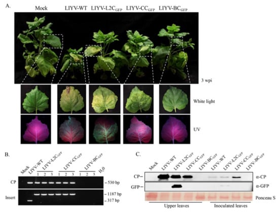 Duplication of the sgRNA CE has been found to cause homologous recombination resulting in the loss of the inserted sequences, while the use of a heterologous sgRNA CE from related viruses were relatively stable []. To determine whether this was also the case for LIYV, the homologous duplication of the 150 nt LIYV CP sgRNA CE in L2CGFP was replaced by the heterologous CP sgRNA CE of Beet yellows virus (BYV, genus Closterovirus) and Cucurbit yellowing stunting disorder virus (CYSDV, genus Crinivirus), assembled as BCGFP and CCGFP. A. tumefaciens cells harboring these constructs together with the wild-type LIYV RNA1 clone were infiltrated into leaves of Hc-Pro N. benthamiana plants and symptom development and GFP expression were monitored over time. LIYV symptoms were observed on LIYV-WT, LIYV-L2CGFP and LIYV-CCGFP inoculated plants, whereas no symptoms of infection were seen for the LIYV-BCGFP construct (Figure 4A). Surprisingly, the GFP fluorescence was only detected for LIYV-L2CGFP infected plants under the UV light (Figure 4A). Systemic infection and protein expression were confirmed by RT-PCR and immunoblot analysis. Consistent with the symptom development, the sequences of LIYV CP and the inserted cassette were detected within upper non-inoculated leaves of LIYV-WT, LIYV-L2CGFP and LIYV-CCGFP infected plants, indicating systemic infection of these constructs and integrity of the insertions, and no LIYV RNA was detected from LIYV-BCGFP inoculated plants (Figure 4B). Western blot analysis performed with total protein extracts from agroinoculated and upper non-inoculated leaves showed that both LIYV CP and GFP were detected in LIYV-L2CGFP infected leaf samples, and although a similar CP expression level was found in LIYV-CCGFP infected plants, no GFP expression was detected (Figure 4C). As expected, no LIYV infection was detected with LIYV-BCGFP inoculated plants.