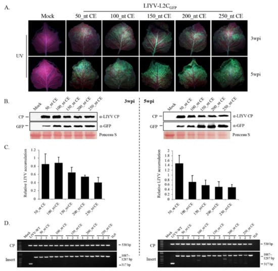 Effects of the size of LIYV CP subgenomic controller element (CE) on viral infection and GFP expression in Hc-Pro Nicotiana benthamiana plants. (A) GFP fluorescence visualized under UV light on upper leaves of N. benthamiana plants infected by five LIYV-L2CGFP constructs comprising CP CEs ranging from 50–250 nt at 3 wpi and 5 wpi. (B) Immunoblot analysis of LIYV CP and GFP accumulation with total protein extracts from upper non-inoculated leaves at 3 wpi and 5 wpi using LIYV CP and GFP specific antibodies. The Ponceau S stained Rubisco large subunit serves as a loading control. (C) Quantification of LIYV RNA1 accumulation with total RNA isolated from upper non-inoculated leaves at 3 wpi and 5 wpi through RT-qPCR. The PP2A transcript level of N. benthamiana was used as an internal control. Error bars denote standard errors from at least three biological replicates. (D) Detection of viral infection and insertion integrity by RT-PCR with total RNA extracted from upper non-inoculated leaves at 3 wpi and 5 wpi. Two primer sets were used to amplify the sequence of LIYV CP (CP, 530 bp) and the sequence flanking the GFP cassette (Insert, ranging from 1087–1287 bp), LIYV-WT without the insert was amplified as a control (317 bp).
