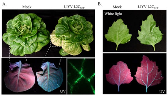 Since the agroinoculation system of LIYV infectious clone is only practical for permissive N. benthamiana plants, and because LIYV has a wide plant host range, the ability of LIYV-L2CGFP to be transmitted by its natural vector, the whitefly B. tabaci, to other host plants and to express inserted sequences was assessed. B. tabaci do not efficiently feed on N. benthamiana plants and thus cannot acquire LIYV directly from agroinoculated plants, therefore virions were purified from LIYV-L2CGFP-agroinoculated plants. Nonviruliferous B. tabaci were allowed to feed on a sucrose diet containing purified LIYV-L2CGFP particles, and then transferred to six three-to-four leaf stage lettuce plants (Lactuca sativa L.) and six Chenopodium murale plants for virus inoculation []. All plants inoculated by viruliferous B. tabaci became infected and showed typical LIYV symptoms 3–4 weeks post inoculation (Figure 6). GFP expression was observed in systemically infected lettuce and C. murale plants by exposing plants to UV-light and by fluorescence microscopy (Figure 6). Like for N. benthamiana plants, fluorescence was most apparent in older leaves showing typical interveinal yellowing symptoms, and was restricted to veins.