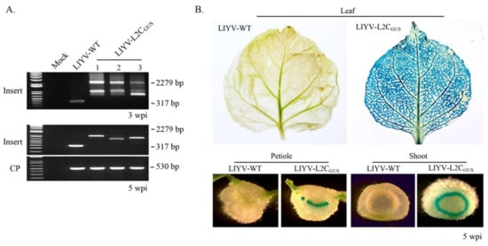 Viral infection and GUS activity in LIYV-L2CGUS inoculated Hc-Pro Nicotiana benthamiana plants. (A) Detection of viral infection and insertion integrity by RT-PCR with total RNA extracted from upper non-inoculated leaves at 3 wpi and 5 wpi. Two primer sets were used to amplify the sequence of LIYV CP (CP, 530 bp) and the sequence flanking the GUS cassette (Insert, 2279 bp), LIYV-WT without the insert was amplified as a control (317 bp). The bands in between indicate partial deletions of the GUS cassette. (B) Systemic spread and distribution of GUS activity monitored in intact leaves and the cross-sections of petioles and shoots of LIYV-L2CGUS infected plants at 5 wpi. Blue stain indicates GUS activity and was detected only in the vascular tissues. Tissues from LIYV-WT infected plants are applied as a negative control.