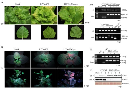 LIYV constructs were delivered to the target plants by agroinoculation or whitefly (Bemisia tabaci) transmission. For N. benthamiana plants, LIYV constructs were transformed into Agrobacterium tumefaciens (strain GV3101) and agroinfiltrated into plants at 4–6 leaf stages as described before []. For lettuce and C. murale plants, LIYV virions were purified from systemically infected N. benthamiana plants following the protocol described by Klaassen, et al. []. After a 6 to 10 h acquisition period on an artificial sucrose diet containing LIYV particles, the viruliferous B. tabaci were transferred onto six young lettuce plants and six C. murale plants for virus inoculation []. Whiteflies were eliminated with insecticide after a three-day inoculation access period.