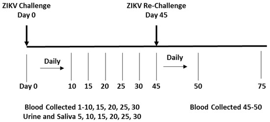 For the initial challenge, animals were inoculated subcutaneously (SC) with a ZIKV isolate from either the Asian-lineage (PRVABC59 or PLCal_ZV) or the African-lineage (IbH_30656) at the indicated doses (Table 1). Biological fluid samples (blood, urine, and saliva) were collected between days 0–30 post initial challenge (Figure 1). Following a 2-week resting period, the 12 animals originally challenged with each isolate in Phase 1 were distributed into two groups composed of one male and one female from each low, medium and high dosing group and re-challenged at a dose of 1 × 106 PFU/animal using either the identical strain they were previously exposed to or a different strain as indicated in Table 2. Serum collection during the re-challenge phase paralleled the periodicity of the collection time points of the initial challenge phase, between days 45–75 as per Figure 1.