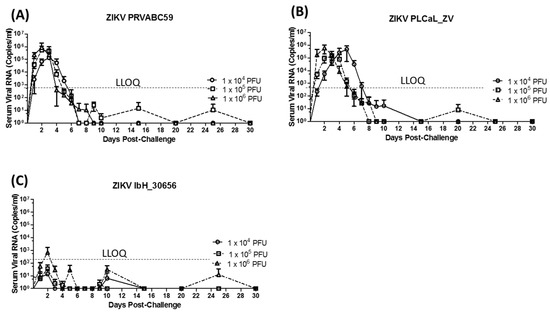 Serum viral RNA copies in IRMs infected with different ZIKV isolates: Serum viral RNA copies in the IRM’s (N = 4 per dose group) infected with different doses of ZIKV isolates as indicated in the figures. (A) PRVABC59 (B) PLCal_ZV (C) IbH_30656. Viral RNA is reported as copies/mL from serum purified from blood collected at multiple time points post challenge between days 0–30. Lower Limit of Quantitation (LLOQ) is shown by the dotted line.