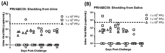 Detectable levels of viral RNA were also observed in urine and saliva samples collected throughout the study from animals challenged with the PRVABC59 and PLCal_ZV strains. However, RNA detection from individual animals was sporadic and independent of dose concentration as demonstrated in Figure 3 for animals challenged with PRVABC59. In this case, low levels of viral RNA (5.3 to 69 copies/mL on average) were detected in urine samples up to day 30 (Figure 3A), yet only one animal challenged with the lowest dose had RNA levels above the LLOQ on day 10 post infection. Viral RNA ranging from 3.9 to 970 copies/mL on average was also observed in saliva samples up to day 25, but again only two samples from animals in the medium dose group had detectable RNA above the LLOQ on days 5 and 10 post-infection (Figure 3B). Results were similar for samples collected from animals challenged with PLCal_ZV; however, viral RNA was only detected in 4 urine samples from animals challenged with IbH_30656 collected over the course of this study while none of the saliva samples had detectable RNA levels [38]. The most notable observation from the analysis of urine and saliva samples from animals challenged with Asian lineage viruses is that viral RNA is most reliably detected (though below the LLOQ) in saliva samples collected 5 days post infection as demonstrated for PRVABC59 in Figure 3.
