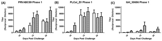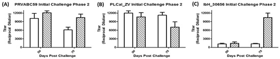 Anti-ZIKV IgG production after secondary challenge with ZIKV. Antibody titers on Study days 50 and 75 during Phase II. Animals from each group in Phase I were reassigned based on previous challenge strain and titer, then re-challenged with 1 × 106 PFU of PRVABC59, PLCal_ZV, or IbH_30656. (A) Primary challenge with PRVABC59 followed by secondary challenge with PRVABC59 (No fill) or PLCal_ZV (Hatched lines); (B) Primary challenge with PLCal_ZV followed by secondary challenge with PLCal_ZV (No fill) or PRVABC59 (Hatched lines); and (C) Primary challenge with IbH_30656 followed by secondary challenge with IbH_30656 (No fill) or PRVABC59 (Hatched lines).