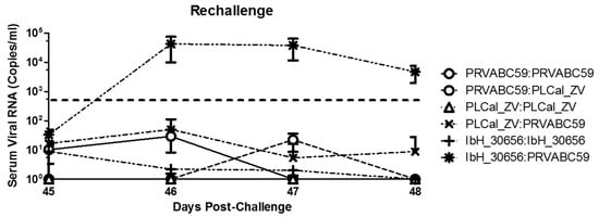 Serum viral RNA copies post rechallenge in IRMs: Serum viral RNA copies were determined by qRT-PCR in IRMs (N = 6 per group) previously infected and re-challenged with either PRVABC59, PLCal_ZV, or IbH_30656 at a dose of 1 × 106 PFU/IRM. Viral RNA is reported as copies/mL of serum purified from blood collected at multiple time points post re-challenge between days 45–50. Note, for the IbH_30656:IbH_30656 group day (50) viral RNA copies were determined from N = 3. Lower Limit of Quantitation (LLOQ) is shown by the dotted line.