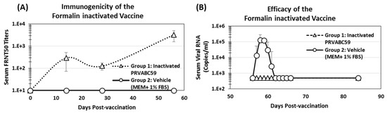 Formalin Inactivated PRVABC59 Vaccine (lot number 2016) [37], with a concentration of 5 µg/0.5 mL, obtained from Walter Reed Army Institute of Research (WRAIR, Springfield, MD, USA) was used for the study. Prior to Study day 0, four (4) IRMs were randomized into two groups (2 animals/group) according to gender/weight using Provantis Software. On days 0 and 28, all animals were anesthetized and inoculated intramuscularly (IM) with inactivated-PRVABC59 vaccine (Group 1) or SC with Minimal Essential Medium supplemented with 1% FBS as a vehicle control (Group 2). On day 56, all macaques were anesthetized and challenged SC with 0.5 mL of ZIKV strain PRVABC59 with a target challenge dose of 1 × 105 PFU per animal. Blood samples were collected on day 0 (prior to immunization), day 14, day 28 (prior to boost) and day 56 (prior to challenge) to determine anti-ZIKV neutralizing antibody (Nab) titer’s by FRNT. Viral load was assessed by qRT-PCR on serum samples collected daily between days 56 and 66 and again on day 85.
