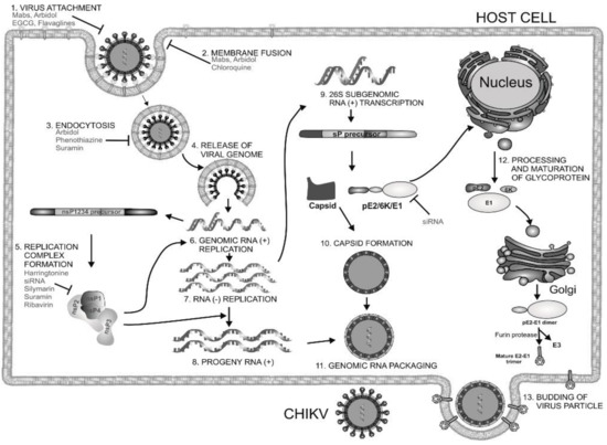 Chikungunya virus (CHIKV) replication cycle and interference by CHIKV inhibitors. CHIKV attaches (1) to the host cell, after which, it is endocytosed (3). The viral envelope and endosomal membrane fusion (2) releases the nucleocapsid (4) into the cytoplasm. The viral genome is liberated followed by translation of nonstructural proteins using the translation process of host cell, leading to the formation of viral replicase (5). This synthesizes a negative- sense RNA strand (7), which acts as a template for generation of the positive-sense RNA (8) and subgenomic (26S) RNA (9). This leads to the expression and maturation of the structural polyprotein (C-E3-E2-6K-E1) (12). The structural polyprotein is cleaved into different structural proteins and the capsid (10), which assemble with the genome to produce the nucleocapsid (11). The nucleocapsid buds out of the plasma membrane while retaining a part of the host plasma membrane with embedded glycoproteins to form the envelope of CHIKV (13). The “T-bar” represents interference in stages of CHIKV life cycle. Arbidol interferes with viral attachment, membrane fusion, and endocytosis of CHIKV. Chloroquine inhibits membrane fusion. Other agents that interfere in these early events of CHIKV cycle include EGCG, flavaglines, monoclonal antibodies, and phenothiazines. Suramin interferes both in endocytosis and CHIKV genome replication. Ribavirin, silymarin, harringtonine, and siRNA inhibit CHIKV by reducing CHIKV genome replication.