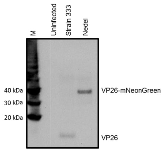 Western blot, visualized with anti-VP26 antibody, indicating that Nedel expresses VP26-mNeonGreen fusion protein. Vero cells were harvested 24 h after infection at an MOI of 10 with either Strain 333 or Nedel. Magic Marker protein standards (M), uninfected Vero cells, HSV-2 Strain 333-infected Vero cells, and Nedel-infected Vero cells are in the lanes left to right.