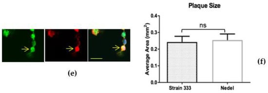 The fluorescent capsid proteins in Nedel exhibited cellular distribution similar to that of HSV-2 glycoproteins, as assessed by immunolabelling in Vero cells (Figure 2a). Cytoplasmic fluorescent puncta, likely corresponding to assembled virions (Figure 2b), nuclear fluorescence (Figure 2c), and cell membrane-associated fluorescence (Figure 2d) were observed, frequently co-localizing with the HSV polyclonal antibodies, indicating that the fusion protein was incorporated into intranuclear capsids and mature virions. Occasionally, the fluorescence from the capsid and pAb overlapped in entire rounded cells without a more distinct fluorescence pattern (Figure 2e). In infected Vero cells (Figure 2f), there was no significant difference in plaque size between HSV-2 Strain 333 (mean plaque area = 0.24 mm2) and Nedel (mean plaque area = 0.25 mm2) (Unpaired t test, p = 0.82).