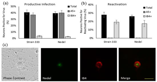 Nedel-infected cultured primary adult murine sensory neurons. (a) Productively infected neurons, quantified by counting total and immunolabeled A5+ and IB4+ subpopulations of neurons that contained mNeonGreen, expressed as a percentage of neurons counted. (b) Reactivating neurons, expressed as a percentage of total neurons reactivating and a percentage of total reactivations that occurred in A5+ and IB4+ neurons. (c) Representative image of Nedel reactivating in an IB4-labeled neuron, showing that Nedel reactivates in IB4+ sensory dorsal root ganglia neurons, as described previously for wild-type Strain 333 []; yellow bar = 15 µm.