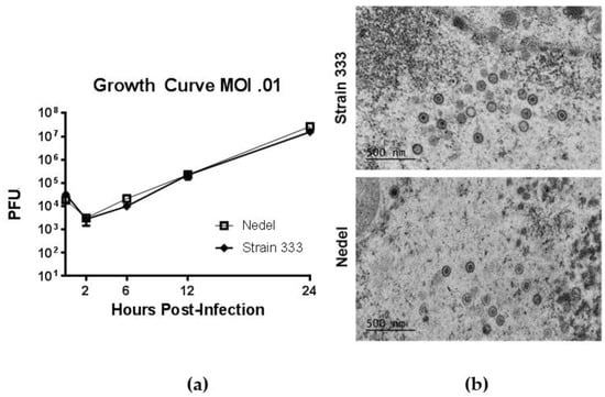 Replication of Nedel in vitro. (a) Growth Curves of Strain 333 and Nedel in Vero cells. Data points are the mean of three separate titrations and error bars reflect SEM. (b) Epoxy-resin-embedding transmission electron microscopic images of Strain 333 and Nedel in Vero cells.