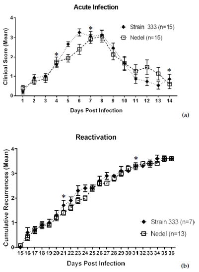 Characterization of Nedel in the guinea pig genital model of HSV infection. (a) Acute severity determined by genital lesion scoring on a scale from 0 to 4. Error bars represent SEM. Significance determined by two-way ANOVA, p = 0.79. (b) Mean cumulative number of recurrent genital skin lesions per guinea pig. Mean recurrence phenotype was determined by observing genital skin for new lesions. Error bars represent standard error of the mean. Two-way ANOVA, p = 0.93. Asterisks (*) above data points indicate days on which vaginal swabs with subsequent plaque assay were performed. On days 4 and 7, 13/13 Nedel-infected animals and 7/7 Strain 333-infected animals yielded 100% green and non-fluorescent plaques respectively. On day 14, 0% animals shed detectable virus. On both days 21 and 31, 2/13 of the Nedel-infected and 1/7 Strain 333-infected animals yielded 100% green plaques and 100% non-green plaques, respectively.