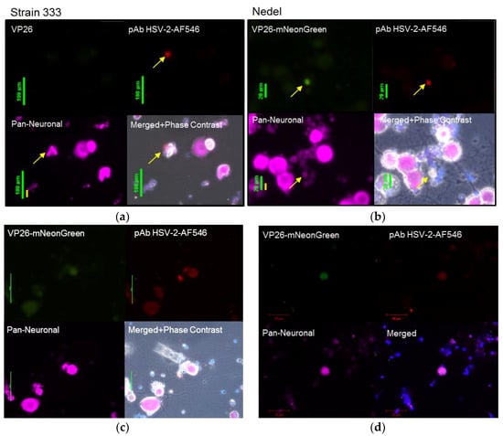 Viral reactivation was also assessed ex vivo from infected animals euthanized on day 36 post-infection. Sacral dorsal root ganglia (DRG) were dissected, enzymatically digested and plated on Matrigel-coated chamber slides. In this model, the axotomy alone stimulates ex vivo reactivation [,]. Slides were then observed for fluorescence. Fluorescent neurons were first observed in cultures at ~60 h post-plating, with maximum fluorescence observed at 72 h post-plating. Cultures were fixed and stained to label neurons and HSV-2 antigen (Figure 6a,b). The neurons from Nedel-infected animals that exhibited green fluorescence also stained positively for non-capsid HSV-2 antigen, further supporting the idea that Nedel is capable of establishing latency in these neurons and of induced reactivation ex vivo after axotomy. Higher fluorescence intensity was observed in small neurons with altered morphology, suggestive of cytopathic effect from a recent reactivation. Double instead of triple staining of cultures (Pan-Neuronal and DAPI) allowed the analysis of more neurons per field of view (Figure 6c), also showing co-localization of green fluorescence and explanted neurons from Nedel-infected animals. Using confocal microscopy, we also observed similar co-localization of green fluorescence (representing the Nedel capsid protein) and red fluorescence (representing HSV glycoproteins) within neurons (Figure 6d).