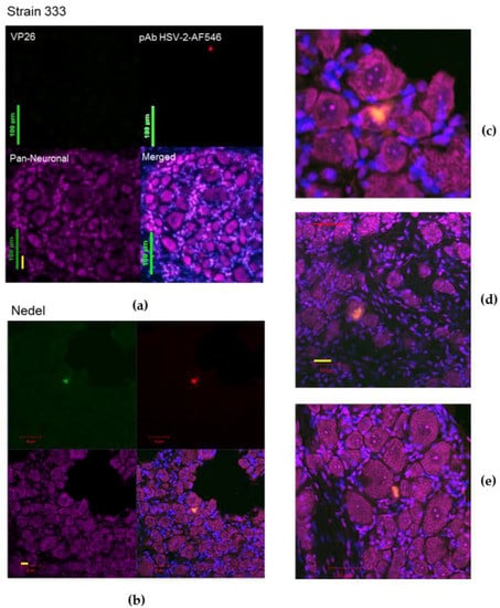 Replication Ex Vivo. Dorsal Root Ganglia were harvested and cultured at 36 days post-infection from 5 guinea pigs intravaginally infected with Strain 333 or Nedel, as previously described []. Briefly, ganglia were digested in papain, collagenase, and dispase (Worthington Biochemical Corporation, Lakewood, NJ, USA) before mechanically triturating and plating on Matrigel-coated 8-well Lab-Tek II chamber slides (Thermo Scientific), followed by mechanical trituration with a pipette. Cultures were then fixed at 60 or 72 h post-plating for 5 min in 4% paraformaldehyde, gently rinsed in phosphate buffer saline (PBS) and immunolabelled as described below. Immunolabelled neuronal cultures were evaluated by fluorescence microscopy using a Nikon Eclipse Ti-E or a Zeiss LSM 710 upright confocal laser scanning microscope.