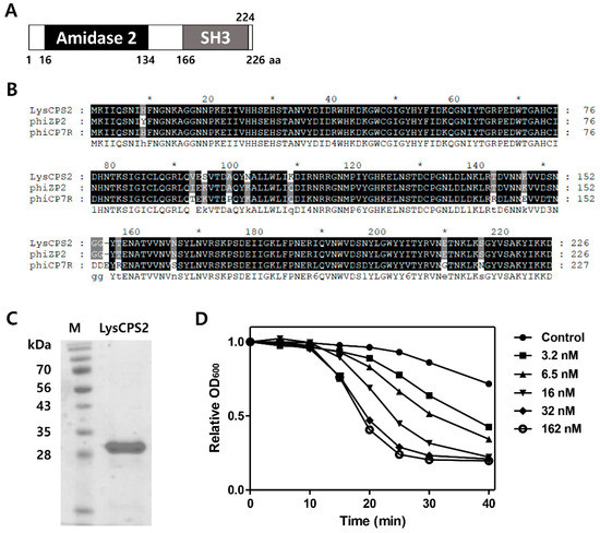 Modular structure and lytic activities of the LysCPS2 endolysin from CPS2. (A) Schematic representation of LysCPS2. The conserved amidase2 domain is shown; (B) Sequence alignment of various Clostridial phage endolysins; CPS2 phage endolysin, phiZP2 phage endolysin, phiCP7R phage endolysin; (C) SDS-PAGE analysis of purified LysCPS2. M: standard molecular weight marker, LysCPS2: purified LysCPS2 fraction; (D) Lysis of C. perfringens ATCC 13124 cells treated externally with various concentrations of recombinant LysCPS2. Optical density was measured periodically after LysCPS2 treatment.