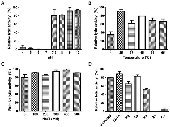 To determine optimum conditions for the endolysin activity, the biochemical properties of LysCPS2 were evaluated. Analysis of lytic activity at different pH levels showed that LysCPS2 had the highest lytic activity at pH 7.5–10 (Figure 3A). More than 60% residual lytic activity was observed in the temperature range from 25 °C to 65 °C (Figure 3B). The effect of ionic strength on the lytic activity of LysCPS2 was assessed at various concentrations of NaCl, ranging from 0 to 500 mM (Figure 3C). LysCPS2 retained its lytic activity even at 500 mM NaCl, suggesting that LysCPS2 is highly stable in a broad range of NaCl concentrations in contrast to the C. perfringens phage phiSM101 endolysin that showed reduced activity in the presence of more than 200 mM of NaCl [7]. Even though phiSM101 endolysin showed 36% amino acid sequence identity with LysCPS2, it was the only C. perfringens endolysin that could be compared with the influence of NaCl on the lytic activity of LysCPS2. To examine the effect of metal ions on the enzyme activity of LysCPS2, metal ions were initially removed from the endolysin with 100 mM EDTA. Addition of EDTA showed little effect on the LysCPS2 activity, indicating that LysCPS2 activity is independent of the presence of divalent cations. All tested metal ions except Ca2+ decreased enzymatic activity of LysCPS2, and the enzyme was completely inactivated in the presence of Zn2+ (Figure 3D). Although many divalent ions have been reported to enhance the enzymatic activity of endolysin, the inhibition effect by certain metal ions on endolysin activity has also been reported in several studies [26,27]. The peptidoglycan hydrolase of Burkholderia pseudomallei phage ST79 showed reduced lytic activity in the presence of Zn2+, Mg2+, or Mn2+ [28]. The inhibition effect of Zn2+ is also found in the T5 phage endolysin [29].