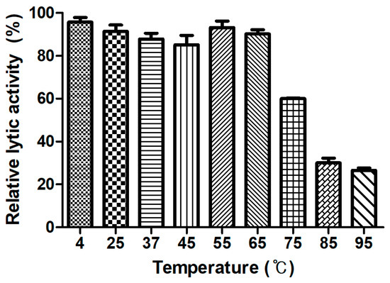 Generally, endolysins are not heat stable, and most lose their hydrolase activity above 50–60 °C [30]. However, few endolysins such as listerial phage endolysins HPL511, HPL118, and HPLP35 have been reported to be thermostable, showing residual activity after 10 min incubation at 90 °C [31]. Stenotrophomonas maltophilia phage endolysin P28 retained 55% of its activity after treatment at 70 °C for 30 min [32], and a thermostable chimeric endolysin, PlyGVE2CpCWB, targeting C. perfringens has exhibited 57% residual activity at 55 °C [33]. LysCPS2 showed remarkable heat stability. The lytic activity after pre-incubation of the enzyme at temperatures between 4 °C and 65 °C was not reduced compared with the heat-untreated control. LysCPS2 retained more than 30% of its activity after heating at 95 °C for 10 min and 60% after heating at 75 °C for 10 min (Figure 4). This is the first report to characterize highly thermostable endolysin isolated from virulent C. perfringens bacteriophage. This enzyme will provide powerful tools for many applications in molecular biology, biotechnology, and medicine [34].