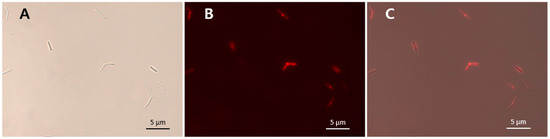 mCherry_LysCPS2_CBD binding activity. LysCPS2_CBD binds to C. perfringens human isolate cells. Bright field (A), fluorescence (B) and merged (C) images are shown.
