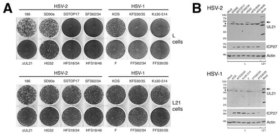 Studies from multiple laboratories using different strains/species of HSV lacking pUL21 have yielded conflicting results regarding the necessity of pUL21 in HSV replication [1,2,11]. To resolve this discrepancy, we sought to isolate pUL21 deficient viruses from multiple HSV strains using a common methodology that avoided selective pressure. We viewed CRISPR/Cas9 mutagenesis as the most pragmatic approach for isolating these viruses, as it avoided the necessity of establishing a BAC of every strain we wished to study and, instead, required simpler starting materials. Viral DNAs were prepared from four different HSV strains: two strains of HSV-2 (SD90e and HG52) and two strains of HSV-1 (KOS and F). Viral DNAs were co-transfected along with plasmids encoding two different UL21-specific gRNAs into complementing cells. By using two gRNAs in these co-transfections, we anticipated introducing deletions into UL21 that could be readily detected by PCR, thereby simplifying our identification of viruses lacking pUL21. Indeed, we found our CRISPR/Cas9 mutagenesis approach to be straightforward and efficient, yielding a considerable fraction of viruses with a deletion in UL21 (Figure 1B, 3 out of 4 viruses contain a deletion in UL21 in the top example, and 5 out of 6 viruses contain a deletion in UL21 in the bottom example). Complementing cells were used in the initial co-transfections and for propagating recovered viruses, to avoid selective pressure that could result in the appearance of second-site suppressor mutations. A wide variety of lesions were introduced into UL21, including premature stop codons, frameshift mutations, and in-frame deletions, all of which would be predicted to give rise to truncated forms of pUL21. Two independent pUL21 deficient viruses were chosen from each strain for further characterization (Figure 1A). Production of pUL21 by L cells (L21 cells) was able to complement the pUL21 deficiency of these viruses (Figure 2A), and pUL21 was not detected in whole cell lysates prepared from L cells infected with these viruses (Figure 2B).