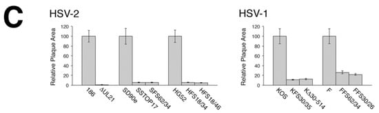 To quantify the differences in cell-to-cell spread, plaque areas produced by pUL21 deficient viruses on Vero cells at 24 hpi were measured and scored relative to the plaque areas yielded by their parental viruses (Figure 3B,C). All pUL21 deficient viruses had significantly smaller plaque areas than their parental viruses (all p values < 0.0001). The difference in plaque size between pUL21 deficient virus and its parental virus was significantly greater for HSV-2 mutants than for HSV-1 mutants (p values ranged from <0.0001 to 0.0024). Strain-specific differences in mutant plaque sizes were also noted for both HSV species: SD90e and HG52 mutant plaque sizes were significantly greater than those of the UL21 mutant derived from strain 186 (all p values < 0.0001) and F mutant plaque sizes were significantly greater than those of KOS mutants (p values ranged from <0.0001 to 0.0011). Collectively, these findings demonstrate that pUL21 is uniformly required for cell-to-cell spread of HSV. Furthermore, both species-specific and strain-specific differences in the strictness of this requirement have been revealed by this analysis.