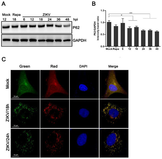 P62 acts as an adaptor of LC3-II and is specifically degraded by the autophagy-lysosome pathway [33]. The inhibition of autophagy is associated with the accumulation of p62. Therefore, its degradation is considered to be an indicator in the assessment of normal autophagic flux. To explore whether the autophagic response induced by ZIKV was complete, the expression of p62 was measured by western blot analysis. Compared to the mock-infected control, the degradation of p62 in HUVEC increased starting at 12 h post-ZIKV infection. We also observed a reduction in the expression of p62 in cells treated with rapamycin. Furthermore, there was a statistically significant decline in the expression levels of p62 protein at 48 hpi (Figure 2A,B).