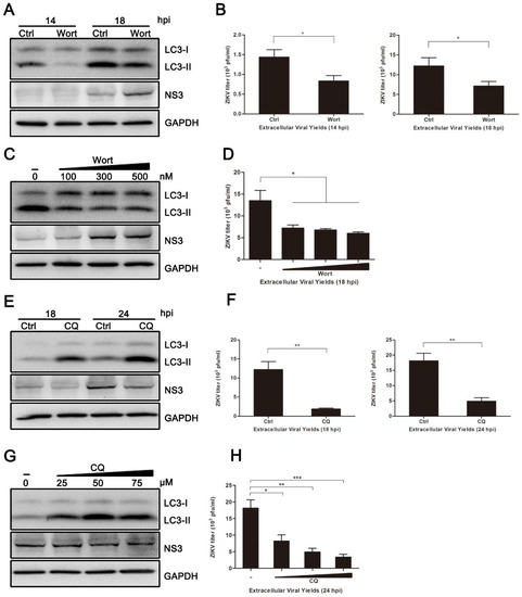 To analyze the effect of autophagy on ZIKV production in HUVEC, autophagic inhibitors, wortmannin (Wort) and chloroquine (CQ), were employed to block the autophagic response. Wort inhibits autophagy in the early stages by inhibiting the phosphatidylinositol3-kinase (PI3K) pathway. CQ acts as an autophagic inhibitor during the late stages, because it causes accumulation of sequestered material in either autophagosomes or autolysosomes [34]. As shown in Figure 3A,B, the conversion of LC3-I to LC3-II was reduced in Wort-treated HUVEC when compared to the control cells. Additionally, titers of viral progeny were noticeably reduced in Wort-treated cells, with a ~1.70-fold reduction occurring at both 14 and 18 hpi. Surprisingly, the expression of viral NS3 protein was not correspondingly decreased (Figure 3A). CQ treatment significantly increased the conversion of LC3-I to LC3-II in ZIKV-infected cells, and the expression of viral NS3 protein at 18 and 24 hpi was decreased. The yields of extracellular virus were decreased 6.51-fold at 18 hpi and 3.68-fold at 24 hpi (Figure 3E,F). Furthermore, both Wort and CQ treatment reduced the extracellular yields of ZIKV progeny (Figure 3D,H). The indicated concentrations of drugs did not affect the cell viability. These data from pharmacological experiments demonstrate that inhibition of autophagy, especially at late stages, reduces ZIKV production in HUVEC.