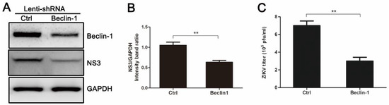 Beclin-1 is critical for the signaling pathways involved in autophagosome formation [15]. As shown in Figure 4A,B, HUVEC expressing Beclin-1-specific short hairpin RNA (shRNA) exhibited a decrease in endogenous Beclin-1 protein and viral NS3 protein when compared with control cells infected with an empty lentivirus vector. The reduced level of Beclin-1 protein resulted in a 2.33-fold decrease in extracellular virus yields (Figure 4C). These results suggest that autophagy machinery is required for effective infection of ZIKV, which agrees with the results of pharmacological experiments.
