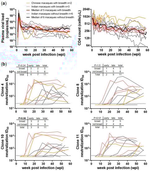 Comparisons between SHIVSF162P3N infected rhesus macaques with (n = 5, light orange/red) and without (n = 6, grey) HIV-1 neutralization breadth. (a) Longitudinal plasma viral load and CD4 count, with bold red and black lines indicating the median values of the two macaque groups; (b) Longitudinal homologous neutralization ID50 titers against 4 SHIVSF162P3N inoculum-derived Env-pseudoviruses, clones 4, 8, 10 and 11. The early (before 20 wpi) and late (after 20 wpi) neutralization responses were compared between the two macaque groups in a contingency table included in each neutralization plot, with Fisher’s exact test p values indicated.