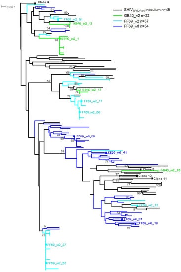 Transmitted/founder (T/F) viruses in SHIVSF162P3N infected macaques GB40 and FF69. The color-coded neighbor-joining tree shows the gp120 V1-V5 nucleotide sequences from the SHIVSF162P3N inoculum, GB40_w2 plasma, FF69_w2 and FF69_w8 plasmas. The tree is rooted at the SHIVSF162P3N inoculum-derived clone 4, with the scale bar indicated and bootstrap values >50 shown at the corresponding branch nodes. The cloned full-length env sequences are indicated with a square symbol and labeled with the clone number.
