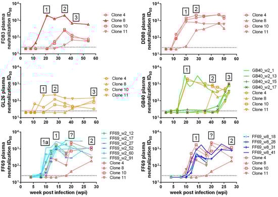 Longitudinal plasma neutralization ID50 titers against the SHIVSF162P3N inoculum-derived clones 4, 8, 10 and 11, and against the autologous T/F or w8 viruses in macaques FD83, GB40 and FF69. Each line represents a tested Env-pseudovirus as indicated. Boxed numbers or question marks denote sequential waves or questionable waves of neutralizing antibody responses defined by the tested Env-pseudoviruses.