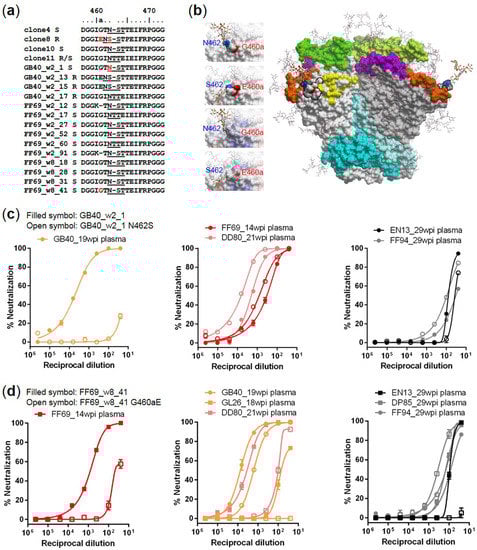 To map the targets of wave 1 neutralizing antibodies, we aligned the amino acid sequences of the tested Env clones and identified two mutations in gp120 V5 that were associated with changes in neutralization sensitivity, N462S for GB40_w2_1 and G460aE for FF69_w2 and FF69_w8 clones (Figure 4a). Note that N462 is a putative N-linked glycosylation site, and the N462S mutation has been associated with the N462 glycan shifting to N461 in the resistant clones. Modeling of the N462 and G460a on a JR-FL SOSIP trimer structure (PDB: 5FYK) [] indicated that both residues were exposed on the surface, and that the orientation of the N462 glycan could be very different when shifted to N461 (Figure 4b). Also, the G460aE mutation introduced a bulkier side chain and a negatively charged surface from a neutral surface in the center of the region (Figure 4b). Therefore, both mutations were likely to significantly alter the potential antibody interacting surface of the V5 region.